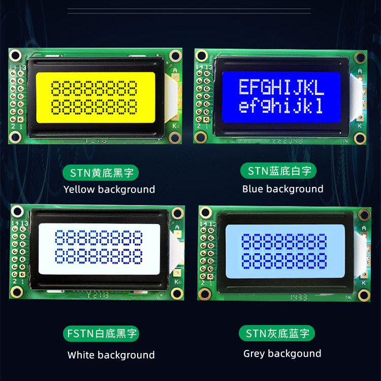 We produces and sells 8x1-40x4 monochrome character modules, including YG (yellow green mode), B (blue mode), FSTN(gray mode),DFSTN (black&white mode) and other display modes. You can choose Eglish,Japanese, Russian, European and other font SPI, parallel ports and I2C Iinterface modes.We accept the development and customization of dot matrix COB module products with different specifications. The products meet the environmental protection requirements and ROHS standards, and are widely used in all kinds of digital character instruments and meters and industrial control displays.